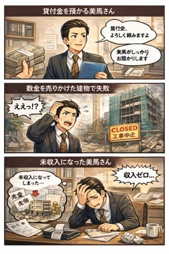 イメージは、ちょっと無理がありますが「貸付金を預かっていた美馬(ば)さんが、敷金を売りかけた建物で失敗して未収入になった。美馬という人が未収入になったイメージ」でOK